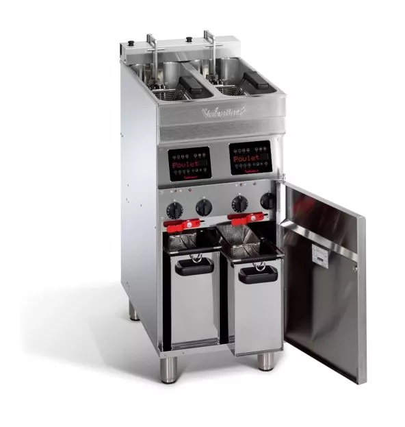 The Evo 2200 computer Fryer is from the new range of Evolution fryers by Valentine. The range feature a fry tank pressed from a single piece of stainless steel, it has a smooth rounded easy to clean profile. The design has a small cool zone which ensures that it takes less oil to fill the fryer but with the same output as the previous model. This means that it will cost less in oil to fill and less to heat a smaller amount of oil thus saving money for the operator and reducing the life-costs in owning a Valentine fryer.